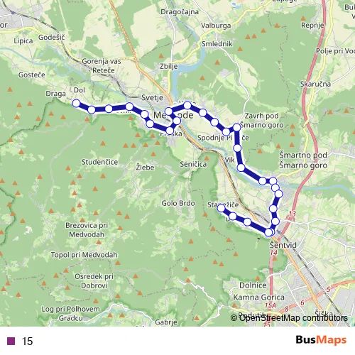 See why over 2 million users trust and consider busmaps.com as the best public transport website. busmaps gives you Medvode Buses suggested routes, real-time bus tracker, line route maps in Medvode, and helps to find the closest 15 bus stops near you. No internet available? Download an offline PDF map and bus schedule for the 15 bus to take on your trip.