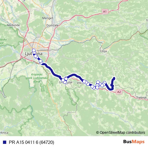 The first stop of the PR A15 0411 6 (64720) bus route is Šentvid pri Stični and the last stop is Ljubljana Ap. PR A15 0411 6 (64720) (PR A15 0411 6 (64720)) is operational during on weekdays.