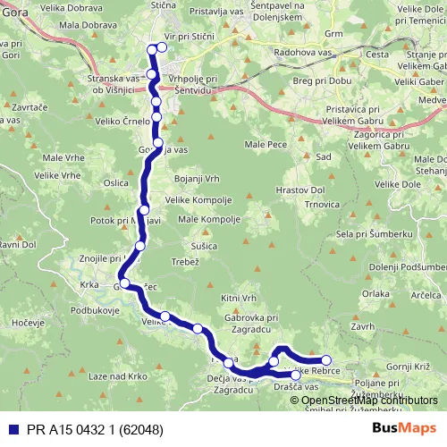 The first stop of the PR A15 0432 1 (62048) bus route is Valična vas and the last stop is Ivančna Gorica Šc. PR A15 0432 1 (62048) (PR A15 0432 1 (62048)) is operational during on weekdays.