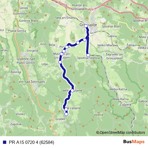The first stop of the PR A15 0720 4 (62584) bus route is Grosuplje and the last stop is Škocjan/Turjaku. PR A15 0720 4 (62584) (PR A15 0720 4 (62584)) is operational during on weekdays.