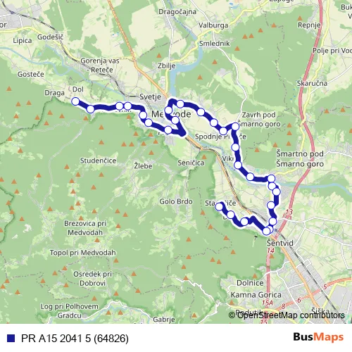 Sora - Rakovnik - Goričane - Vaše - Škofjeloška cesta - Gorenjska cesta - Medvoška cesta - Verje - Zgornje Pirniče - Spodnje Pirniče - Vikrče - Kajakaška cesta - Tacenska cesta - Brodska cesta - Martinova pot - Tacenska cesta - Kosmačeva ulica - Celovška cesta - Dvor - Stanežiče