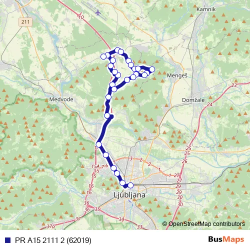 The first stop of the PR A15 2111 2 (62019) bus route is Ljubljana Ap and the last stop is Vojsko/Vodicah. PR A15 2111 2 (62019) (PR A15 2111 2 (62019)) is operational during on weekdays.