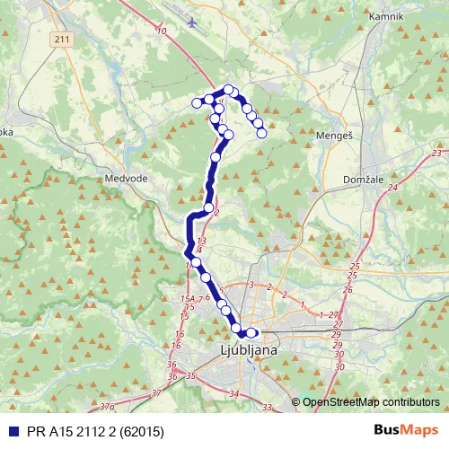 The first stop of the PR A15 2112 2 (62015) bus route is Selo pri Vodicah and the last stop is