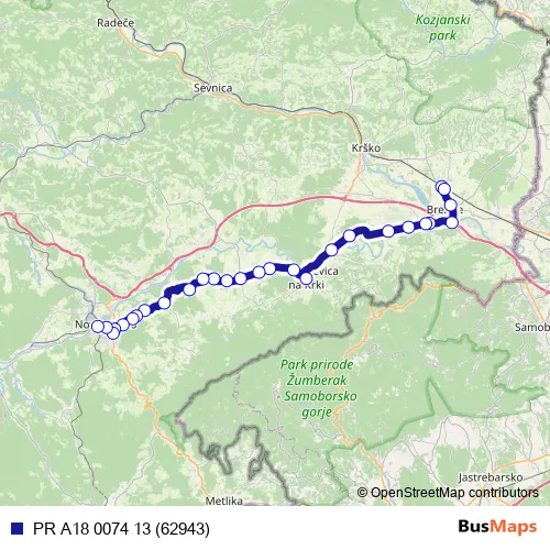 The first stop of the PR A18 0074 13 (62943) bus route is Brežice Žp and the last stop is