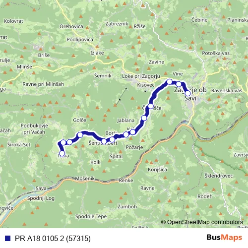 The first stop of the PR A18 0105 2 (57315) bus route is Tirna and the last stop is Zagorje ob S.. PR A18 0105 2 (57315) (PR A18 0105 2 (57315)) is operational during on weekdays.