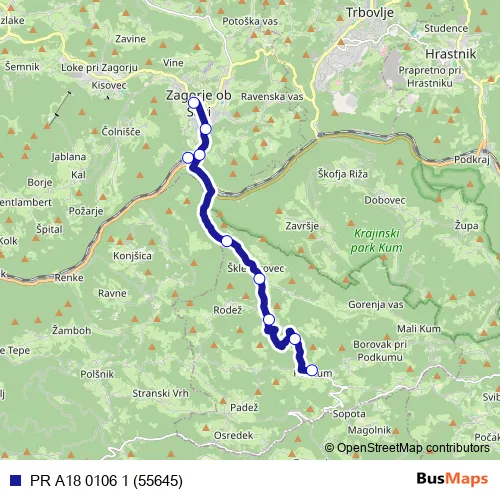 The first stop of the PR A18 0106 1 (55645) bus route is Podkum and the last stop is Zagorje ob S.. PR A18 0106 1 (55645) (PR A18 0106 1 (55645)) is operational during on weekdays.