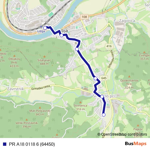 The first stop of the PR A18 0118 6 (64450) bus route is Litija Žp and the last stop is Šmartno pri Litiji Cerk.. PR A18 0118 6 (64450) (PR A18 0118 6 (64450)) is operational during on weekdays.