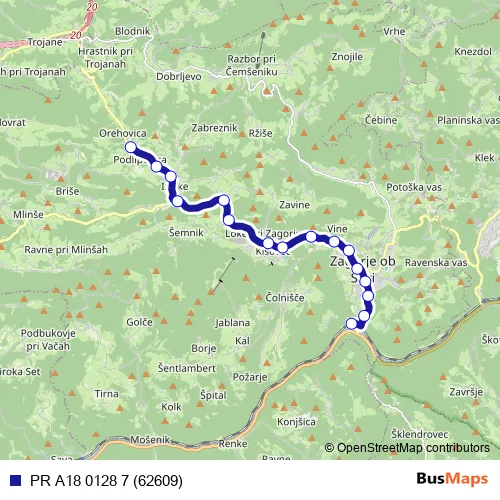 The first stop of the PR A18 0128 7 (62609) bus route is Orehovica/Izlakah and the last stop is Zagorje ob S.Žp. PR A18 0128 7 (62609) (PR A18 0128 7 (62609)) is operational during everyday.