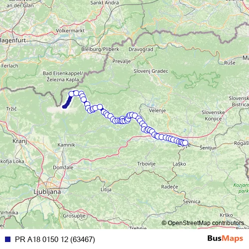 The first stop of the PR A18 0150 12 (63467) bus route is Logarska dolina Sestre Logar and the last stop is