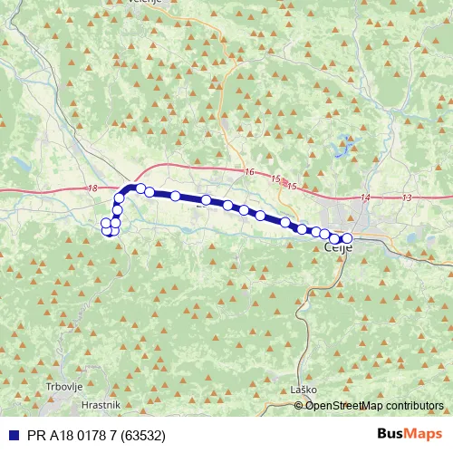 The first stop of the PR A18 0178 7 (63532) bus route is Prebold and the last stop is