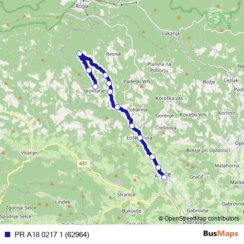 The first stop of the PR A18 0217 1 (62964) bus route is Skomarje and the last stop is