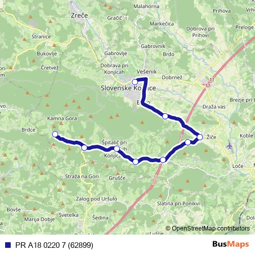 The first stop of the PR A18 0220 7 (62899) bus route is Sojek and the last stop is Sl.Konjice. PR A18 0220 7 (62899) (PR A18 0220 7 (62899)) is operational during on weekdays.