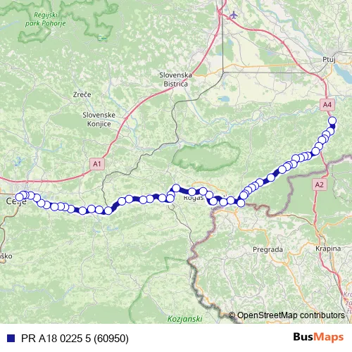 The first stop of the PR A18 0225 5 (60950) bus route is Podlehnik and the last stop is