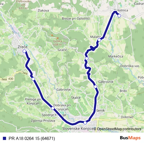 The first stop of the PR A18 0264 15 (64671) bus route is Zreče and the last stop is