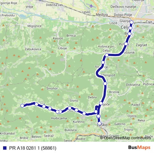 The first stop of the PR A18 0281 1 (58861) bus route is Celje Ap and the last stop is