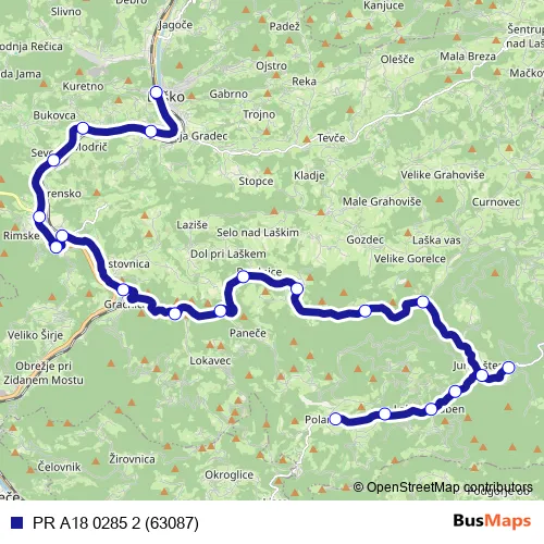 The first stop of the PR A18 0285 2 (63087) bus route is Polana/Jurkloštru and the last stop is Laško. PR A18 0285 2 (63087) (PR A18 0285 2 (63087)) is operational during on weekdays.