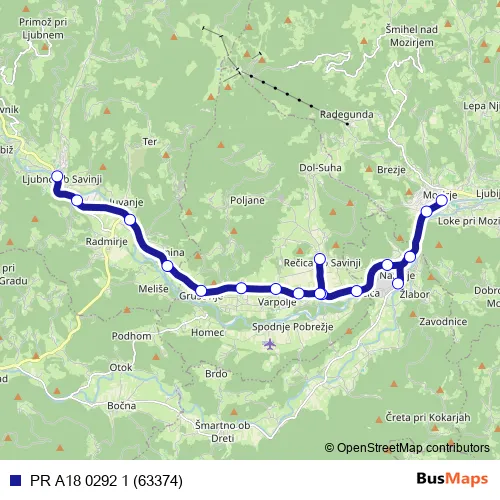 The first stop of the PR A18 0292 1 (63374) bus route is Mozirje and the last stop is Ljubno/Savinji. PR A18 0292 1 (63374) (PR A18 0292 1 (63374)) is operational during on weekdays.
