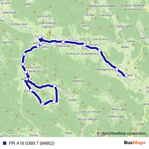 The first stop of the PR A18 0369 7 (64952) bus route is Ambrus and the last stop is Žužemberk. PR A18 0369 7 (64952) (PR A18 0369 7 (64952)) is operational during on weekdays.