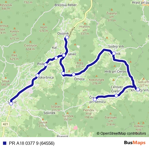 The first stop of the PR A18 0377 9 (64556) bus route is Črešnjevec/Semiču and the last stop is Semič. PR A18 0377 9 (64556) (PR A18 0377 9 (64556)) is operational during on weekdays.