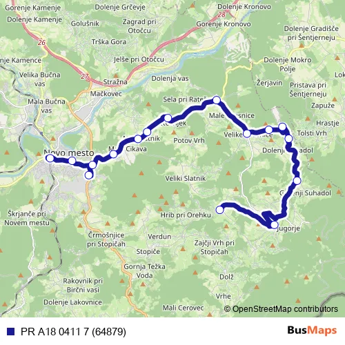 The first stop of the PR A18 0411 7 (64879) bus route is Hrušica/N.mestu and the last stop is Novo mesto. PR A18 0411 7 (64879) (PR A18 0411 7 (64879)) is operational during on weekdays.