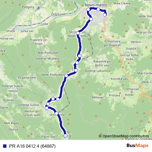 The first stop of the PR A18 0412 4 (64887) bus route is Laze/N.mestu and the last stop is Novo mesto Revoz. PR A18 0412 4 (64887) (PR A18 0412 4 (64887)) is operational during on weekdays.