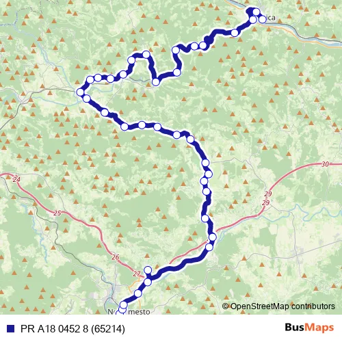 The first stop of the PR A18 0452 8 (65214) bus route is Novo mesto and the last stop is