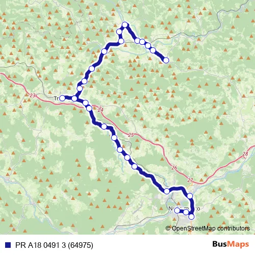 Additional information: PR A18 0491 3 (64975) has 27 stops and the total trip duration for this route is approximately 71 minutes.