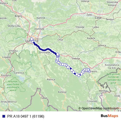 The first stop of the PR A18 0497 1 (61196) bus route is Novo mesto and the last stop is