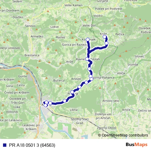 The first stop of the PR A18 0501 3 (64563) bus route is Križe/Pečicah and the last stop is Krško. PR A18 0501 3 (64563) (PR A18 0501 3 (64563)) is operational during on weekdays.