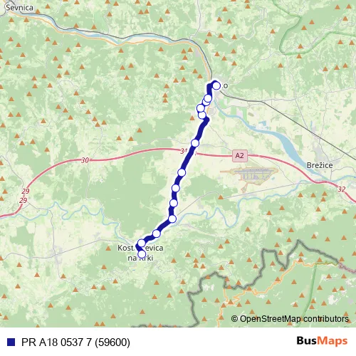 The first stop of the PR A18 0537 7 (59600) bus route is Kostanjevica na Krki and the last stop is Krško. PR A18 0537 7 (59600) (PR A18 0537 7 (59600)) is operational during on weekdays.