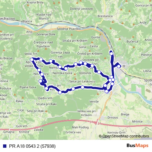The first stop of the PR A18 0543 2 (57938) bus route is Krško and the last stop is Krško. PR A18 0543 2 (57938) (PR A18 0543 2 (57938)) is operational during on weekdays.