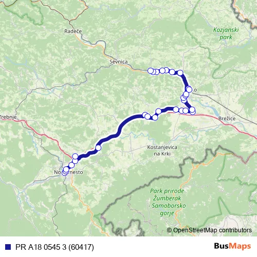 The first stop of the PR A18 0545 3 (60417) bus route is Novo mesto and the last stop is Blanca. PR A18 0545 3 (60417) (PR A18 0545 3 (60417)) is operational during on weekdays.