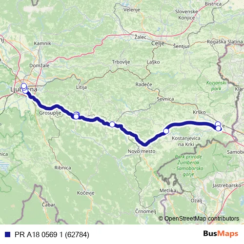 The first stop of the PR A18 0569 1 (62784) bus route is Brežice and the last stop is