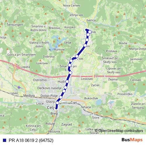 The first stop of the PR A18 0619 2 (64752) bus route is Vojnik Š and the last stop is
