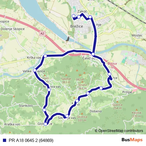 The first stop of the PR A18 0645 2 (64869) bus route is Brežice Zd and the last stop is Brežice Zd. PR A18 0645 2 (64869) (PR A18 0645 2 (64869)) is operational during on weekdays.