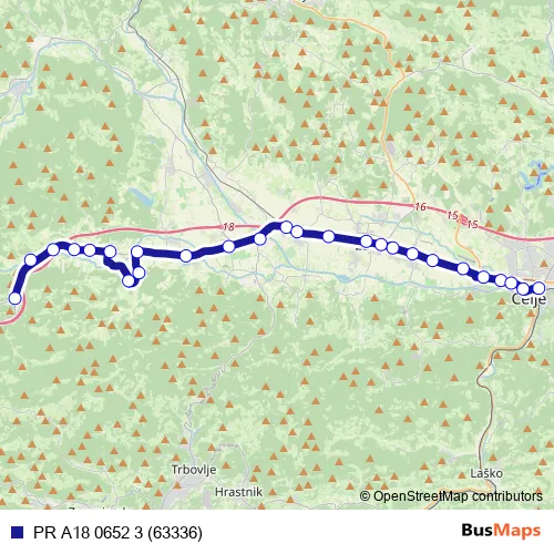 The first stop of the PR A18 0652 3 (63336) bus route is Ločica pri Vranskem and the last stop is Celje Ap. PR A18 0652 3 (63336) (PR A18 0652 3 (63336)) is operational during on weekdays.