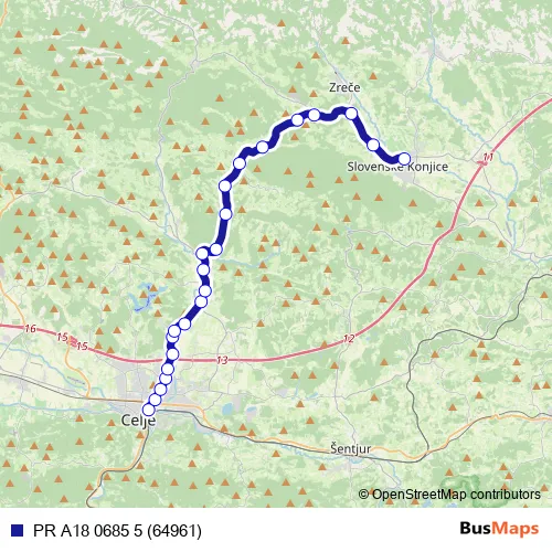 The first stop of the PR A18 0685 5 (64961) bus route is Celje Ap and the last stop is Sl.Konjice. PR A18 0685 5 (64961) (PR A18 0685 5 (64961)) is operational during on weekdays.