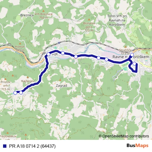 The first stop of the PR A18 0714 2 (64437) bus route is Leše/Prevaljah and the last stop is