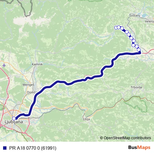 The first stop of the PR A18 0770 0 (61991) bus route is Mozirje and the last stop is