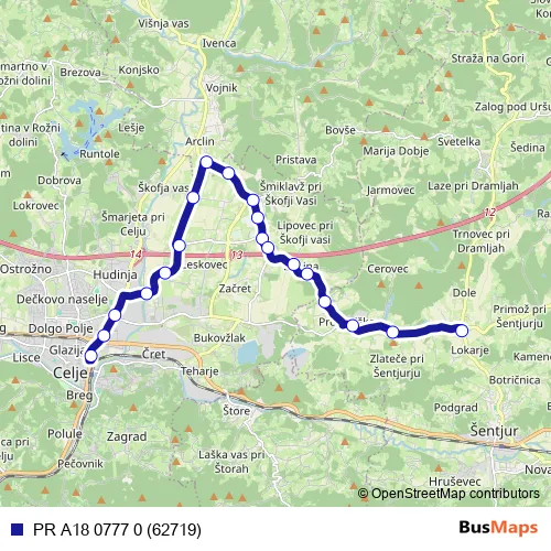 The first stop of the PR A18 0777 0 (62719) bus route is Celje Ap and the last stop is Sele/Šentjurju. PR A18 0777 0 (62719) (PR A18 0777 0 (62719)) is operational during on weekdays.