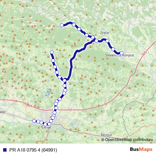 The first stop of the PR A18 0795 4 (64991) bus route is Sl.Konjice and the last stop is