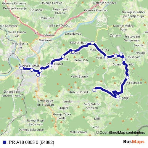 The first stop of the PR A18 0803 0 (64882) bus route is Novo mesto and the last stop is Hrušica/N.mestu. PR A18 0803 0 (64882) (PR A18 0803 0 (64882)) is operational during on weekdays.