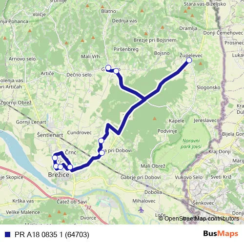 The first stop of the PR A18 0835 1 (64703) bus route is Župelevec and the last stop is Brežice. PR A18 0835 1 (64703) (PR A18 0835 1 (64703)) is operational during on weekdays.