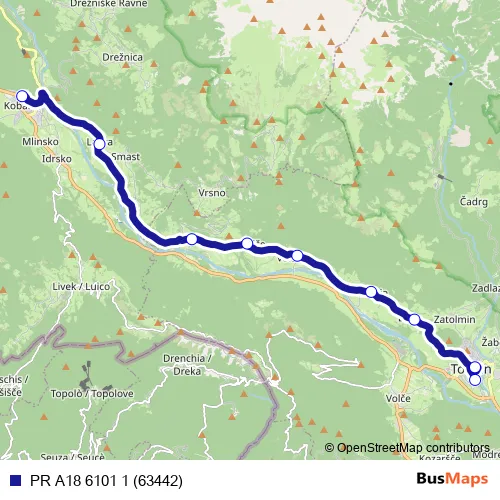 The first stop of the PR A18 6101 1 (63442) bus route is Kobarid and the last stop is Tolmin. PR A18 6101 1 (63442) (PR A18 6101 1 (63442)) is operational during on weekdays.