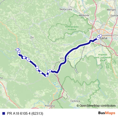The first stop of the PR A18 6105 4 (62313) bus route is Ljubljana Ap and the last stop is