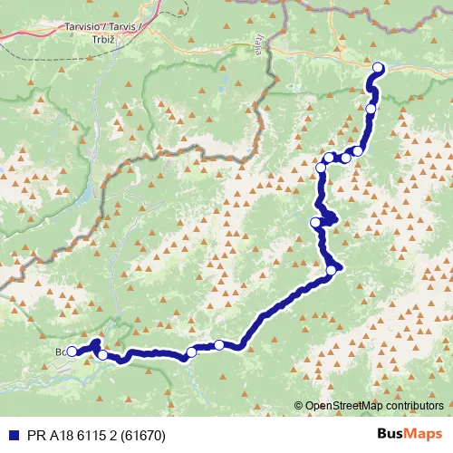 The first stop of the PR A18 6115 2 (61670) bus route is Kranjska Gora and the last stop is Bovec. PR A18 6115 2 (61670) (PR A18 6115 2 (61670)) is operational during everyday.