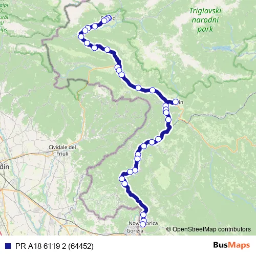 The first stop of the PR A18 6119 2 (64452) bus route is Bovec and the last stop is Nova Gorica Ap. PR A18 6119 2 (64452) (PR A18 6119 2 (64452)) is operational during on weekdays.