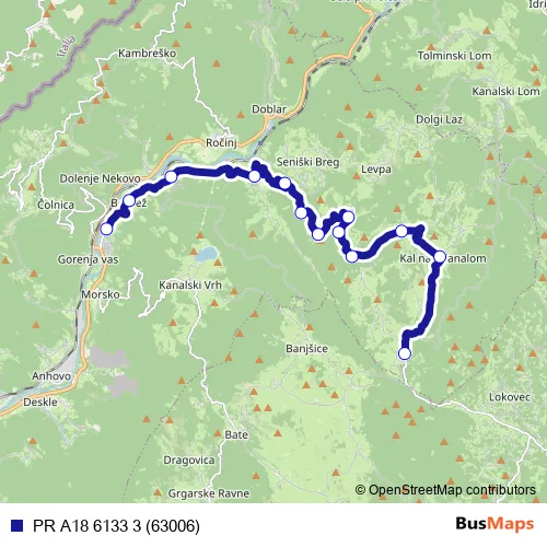 The first stop of the PR A18 6133 3 (63006) bus route is Kanal Š and the last stop is Vrhavč. PR A18 6133 3 (63006) (PR A18 6133 3 (63006)) is operational during on weekdays.