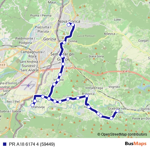 The first stop of the PR A18 6174 4 (59449) bus route is Gradišče/Prvačini and the last stop is