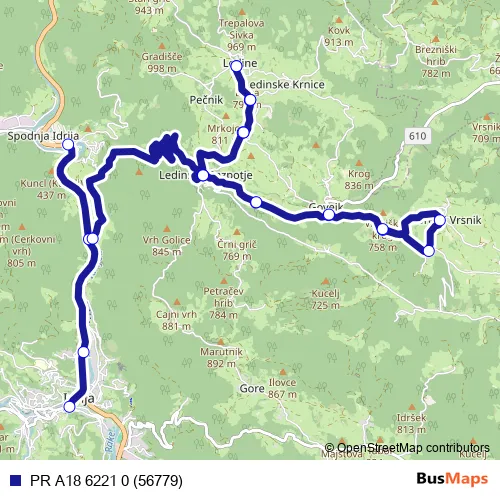 The first stop of the PR A18 6221 0 (56779) bus route is Idrija and the last stop is Ledine. PR A18 6221 0 (56779) (PR A18 6221 0 (56779)) is operational during on weekdays.